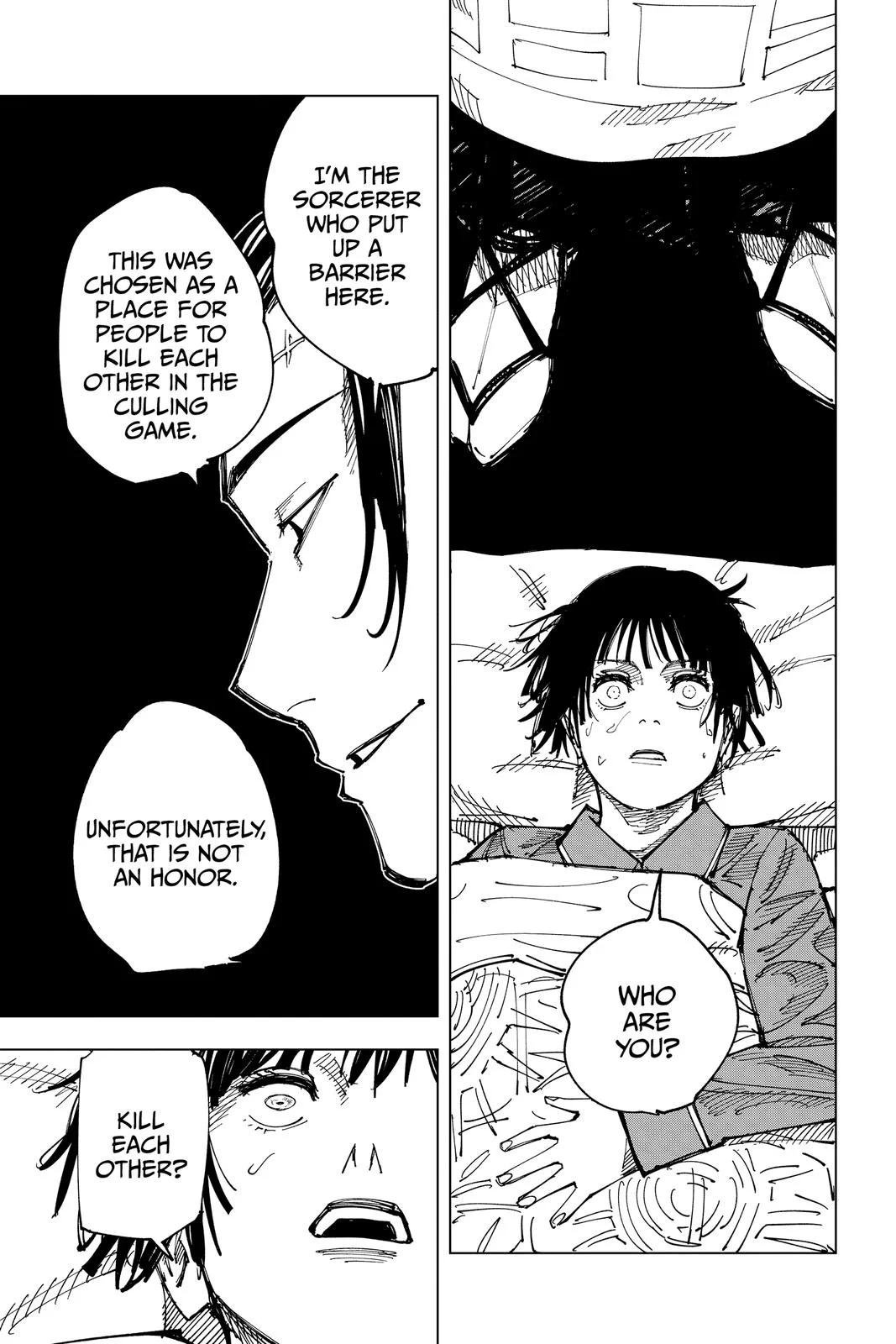 The chapter opens with Master Tengen explaining the mechanics of the Culling Game to the main characters. He details how each participant must declare their entry and follow strict rules set by Kenjaku, the ancient sorcerer who masterminded the event.