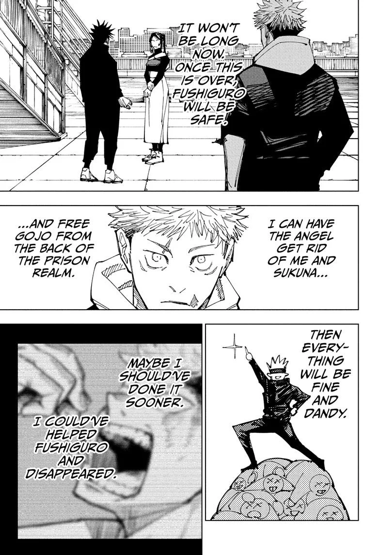 Yorozu explains her actions, expressing a desire to challenge Sukuna, the King of Curses, and selecting her battlefield accordingly. As she takes flight, Yuji Itadori and Hana Kurusu attempt to pursue her. However, Sukuna activates the binding vow he imposed on Yuji, taking control of his body for one minute. During this brief period, Sukuna incapacitates Hana and reveals his plan to possess Megumi’s body permanently