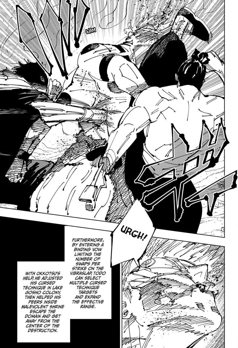 - Technique Upgrade: Todo reveals that his technique has evolved—he can now swap multiple targets simultaneously, increasing both the speed and unpredictability of his movements. This improvement was made possible with help from Yuta Okkotsu.
